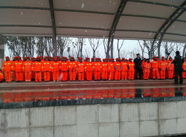 2月28日上午,雪花飄飄,建發公司市政物業部組織2015年度環衛保潔作業人員進行崗前培訓和安全技術交底工作。新招錄的環衛工人統一穿著嶄新的工服,推著嶄新的保潔三輪車,列隊集結,整裝待發。