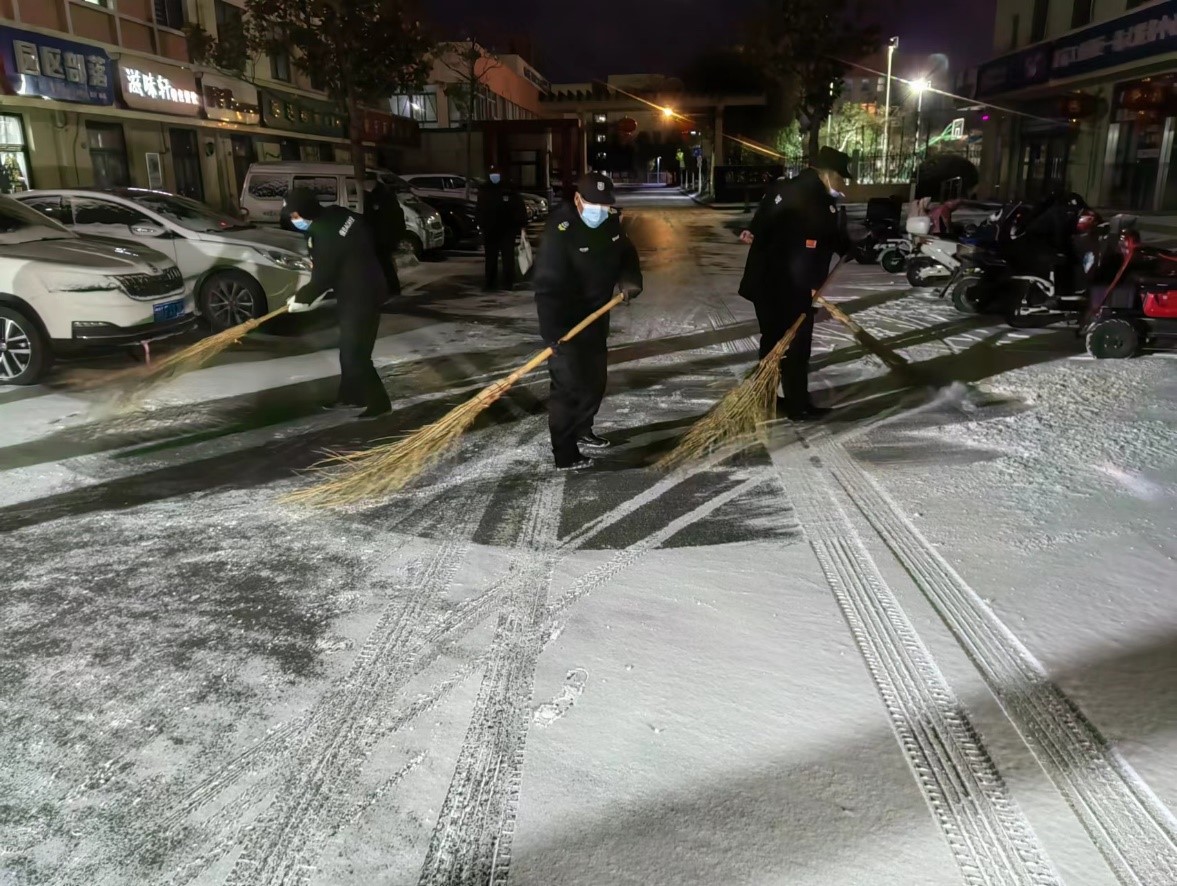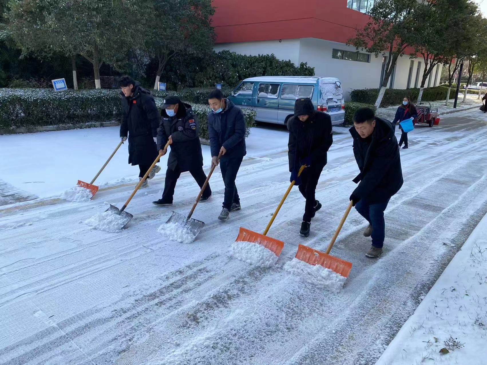 由于夜間雪情,道路積雪結冰,14日夜間,公司啟動應急預案,調集現場人員,利用掃把、鐵鍬針對各道口、坡道及主要行人路段開展作業,確保各項目道路通行順暢。