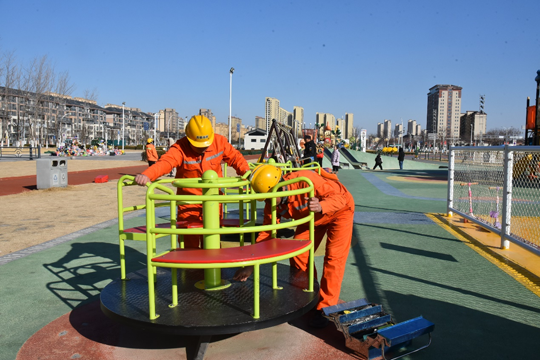 在公園廣場里,秩序井然,工作人員一絲不茍地對游樂健身設施進行全方位檢查,“不遺漏”任何一顆螺絲、一根繩子,確保設施安全運行,讓市民游客過一個“放心年”。
