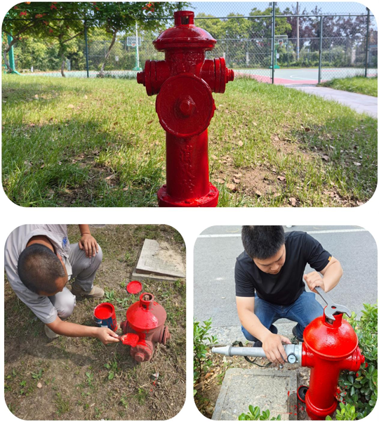 為及時高效完成消火栓翻新工作,工作人員迅速行動,選用材料,攜帶鐵刷、鋼絲球、扳手和油漆,小心拆開消防栓,細心清除銹跡,認真打油上漆,給區域內的消火栓進行除銹打油穿“新衣”,確保消防設施正常有效使用。同時,針對消防栓啟閉閥是否靈活、悶蓋內膠圈是否完整、消防栓零部件是否有損壞缺失、水壓是否正常等情況,進行了現場測試并做好登記和維修,以確保消火栓的安全完整。