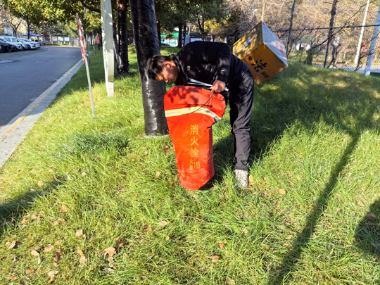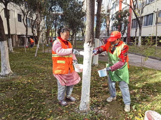 細心的業主不難發現,樹木已悄然穿上整齊的“冬裝”。物業工作人員有條不紊地對喬木根部進行涂白處理。這層白色“防護衣”不僅美觀,更是樹木越冬的“守護者”——它能有效反射部分陽光,減緩樹干因晝夜溫差過大而導致的凍裂風險,同時清除樹皮縫隙中潛藏的害蟲及蟲卵,為來年春季樹木茁壯成長打下堅實基礎。