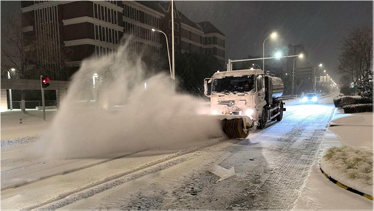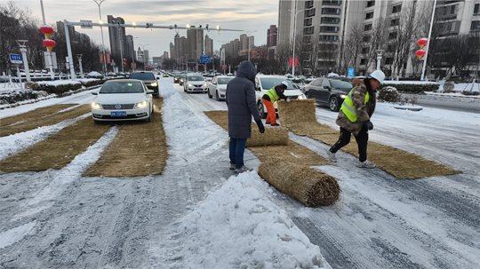 為確保城市主干道及橋梁暢通,建發公司緊抓夜間作業窗口,秉持“人歇車不歇”原則,調配精良設備與人員,對易結冰的橋面及主干道進行高強度清除作業。作業人員利用后半夜車流較少的時機,集中操作雪滾車、撒布機等設備,并同步在關鍵路口鋪設防滑墊。截至20日17時,累計投入各類機械16臺、作業人員320名,撒布融雪劑60噸,有效保障了主要道路的安全通行。