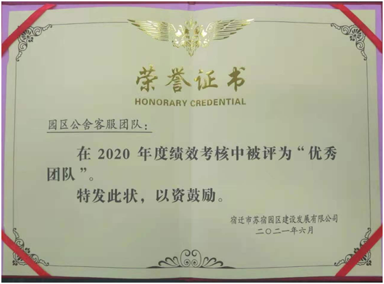 近日,園區(qū)公舍客服條線在2020年建發(fā)公司績(jī)效考核中,榮獲“建發(fā)公司優(yōu)秀團(tuán)隊(duì)”稱號(hào)。