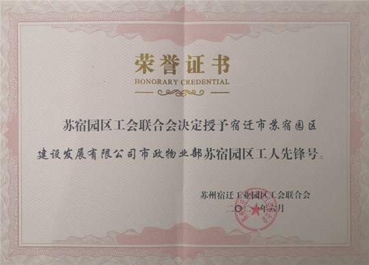 近日,建發公司市政物業部被蘇宿園區工會聯合會授予“蘇宿園區工人先鋒號”榮譽稱號。