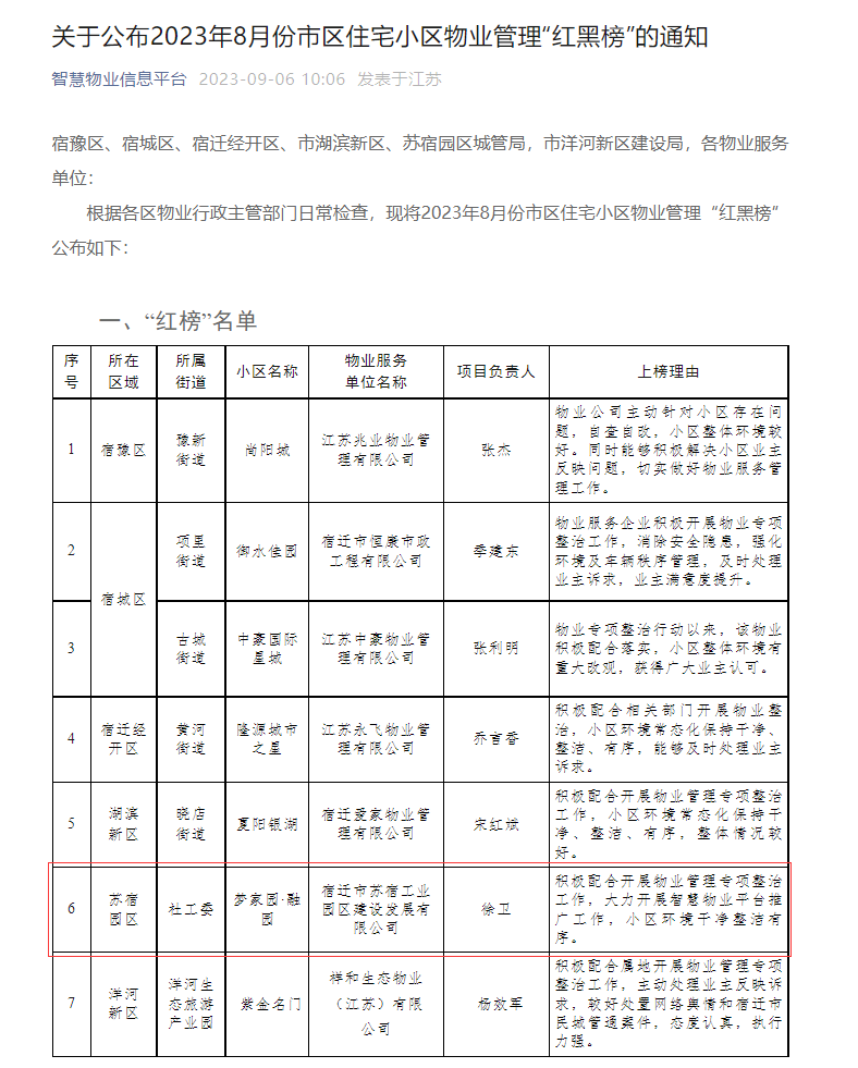 物業服務好不好,“紅黑榜”上見分曉。8月29日,宿遷市住房和城鄉建設局公布8月份市區住宅小區物業管理“紅黑榜”?,建發公司夢家園項目物業服務質量綜合考評“優秀”,榮登“紅榜”。