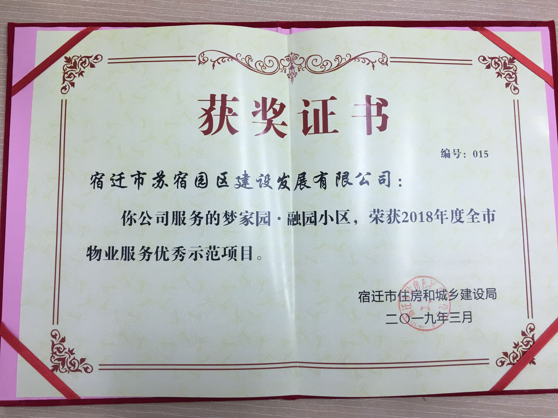 2018年12月,在宿遷市房管局及市物業管理協會組織的全市物業管理項目考核評比活動中,夢家園.融園喜獲“2018年度全市物業服務優秀示范項目”。