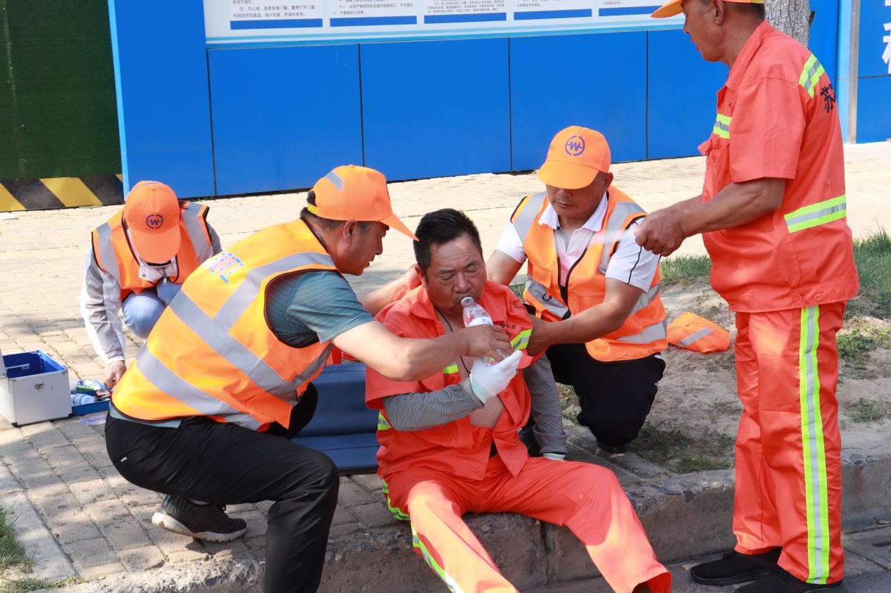 此次演練模擬一名環衛工人在作業過程中,突然感到頭暈、心慌乏力,立即向主管人員電話求助。主管人員隨即趕到現場查看情況,發現環衛工人躺坐在現場,面色潮紅、大汗淋漓,精神狀況不佳,系中暑跡象,立即向項目經理報告,聯系應急救援人員,并呼喊附近作業人員將其攙扶到陰涼處,解開衣扣散熱,應急救援人員趕到現場后,立即用濕毛巾、酒精棉擦拭身體,涂上清涼油,喂服藿香正氣水、淡鹽水......,經過初步救護,中暑人員癥狀得以緩解后,隨即將其送往園區社區衛生服務中心進一步治療。