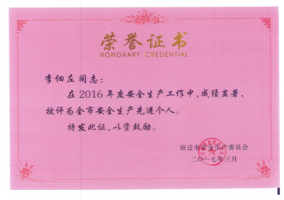 2017年3月,物業部李佃左同志獲得宿遷市安全生產委員會授予的“全市安全生產先進個人”榮譽證書。