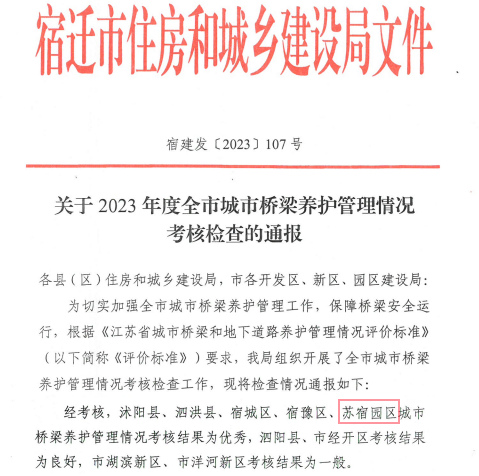 近日,宿遷市住房和城鄉建設局下發2023年度全市城市橋梁養護管理情況考核檢查通報,園區城市橋梁養護管理工作再獲佳績。