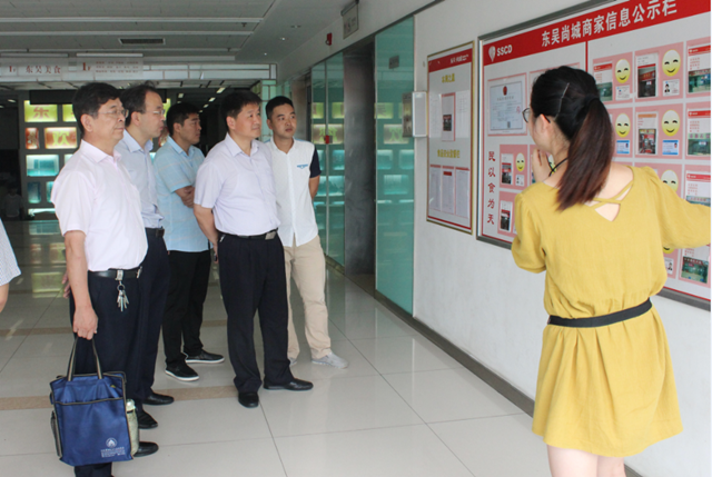 于堅強一行先后參觀了東吳尚城美食城和園區公舍餐廳,聽取了園區小餐飲集中區建設背景和運營狀況的介紹,并先后觀看了園區運用移動終端、二維碼等技術手段推動明廚亮灶、遠程監管、社會共治的現場演示。考察中,于處長對園區積極創新監管手段,推動社會共治,將小餐飲管理出高標準給予了充分肯定,他要求建發公司要進一步創新監管思路,加大食品管理力度,確保食品衛生安全零事故。