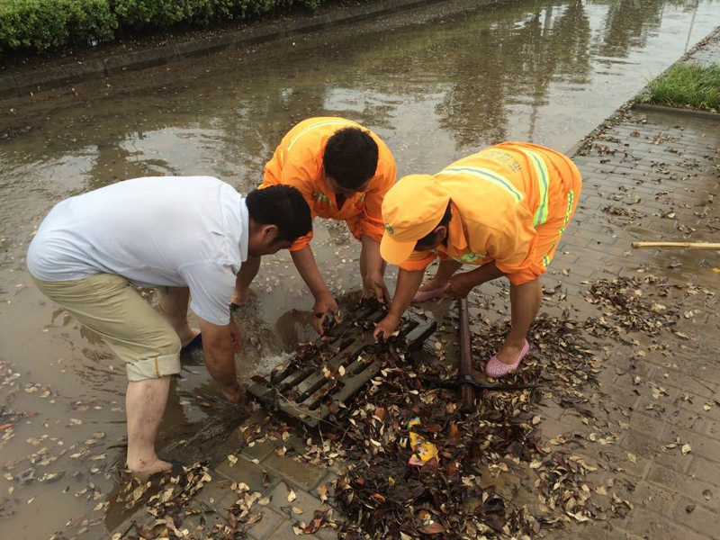 市政搶險疏通小組迅速調集人員及物資力量,開展區內泄洪及排水工作。公舍等項目為迅速排澇,員工在水中冒雨架好水泵,安裝吸水管,鋪設排水水帶,發動機器快速排水,使公舍車庫等水位快速下降。