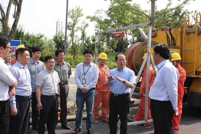 在同里湖路,李榮錦認真聽取了園區城市排水防澇工作進展情況匯報,現場查看了管道疏通清淤工作,并詳細詢問了管道CCTV檢測流程等情況。