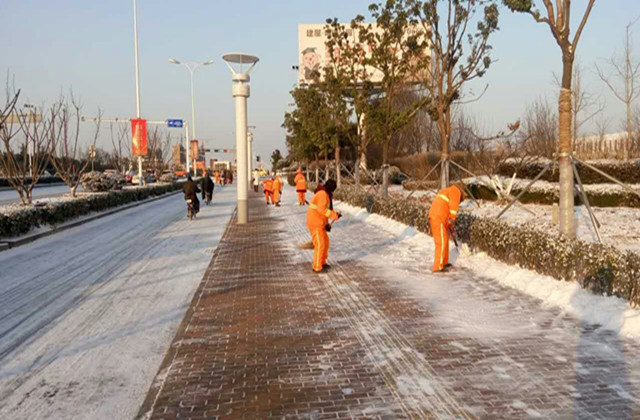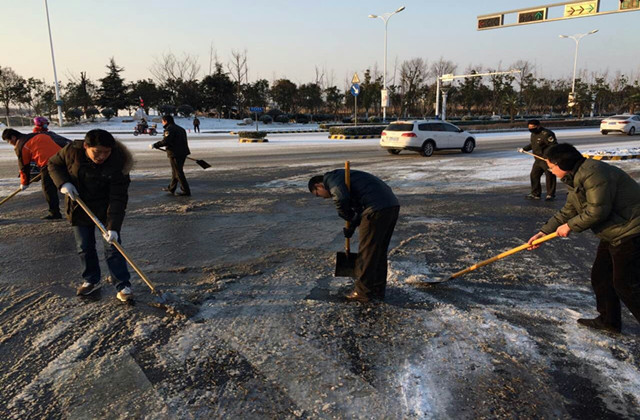 清晨6時,市政部工作人員和環衛工人已經開始對轄區部分主要路段進行除雪除冰作業。在凜冽寒風中,他們不畏嚴寒,經過近3小時的清掃除冰,截至上午9時,青海湖西路、通達大道、紫金山路等主干道及蘇州公園人行道已基本完成路面積雪清掃。