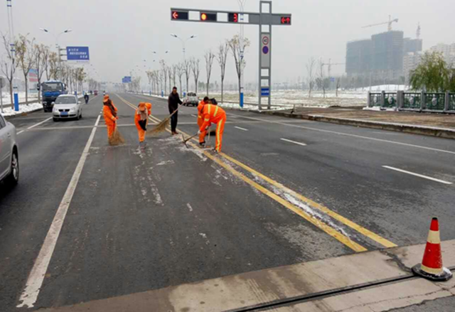 11月24日,小雪節氣剛過,宿遷便迎來了一場突如其來的小雪,雖然路面積雪不多,但伴隨著凜冽的寒風,氣溫驟降,次日早晨部分路面仍存在結冰現象,加上路面落葉較多,環衛工人天未亮就走上街頭開始除雪化冰,對于他們來講,這注定又是忙碌的一天,經過3個小時緊張而有序的忙碌,基本完成了園區主次干道的清掃工作。