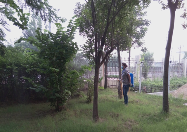 立秋以來天氣晴朗少雨,物業管理部按照園區公舍綠化養護計劃積極開展病蟲害防治工作,組織養護人員在人員流動性較少的時間段對園區公舍的花灌木、球類、綠籬等噴灑氧化樂果、阿維高氯等園林農藥,共用30瓶農藥,有效控制了園區公舍綠化病蟲害的發生。