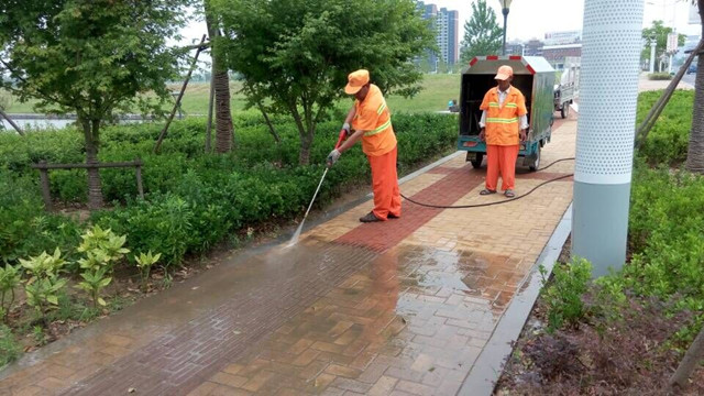 為切實提高園區道路保潔作業質量,實現精細化管理目標,6月份以來,建發公司積極組織清洗車和環衛工人對全區的人行道展開清洗行動。